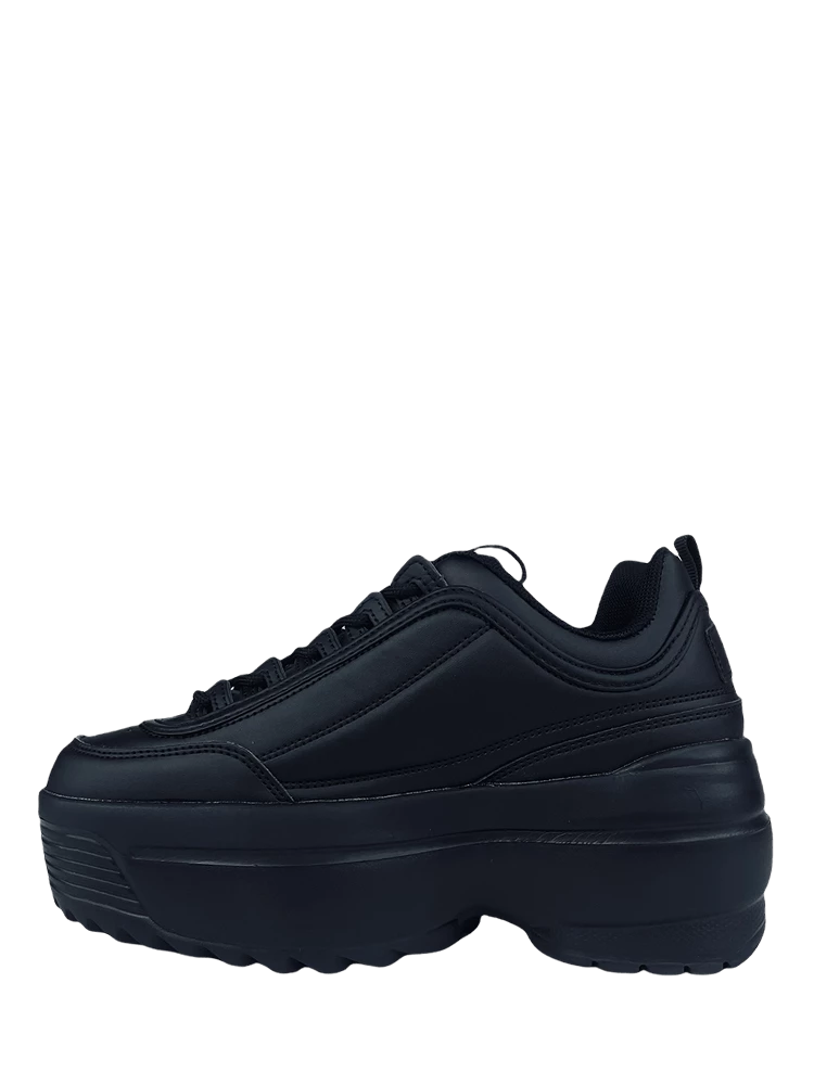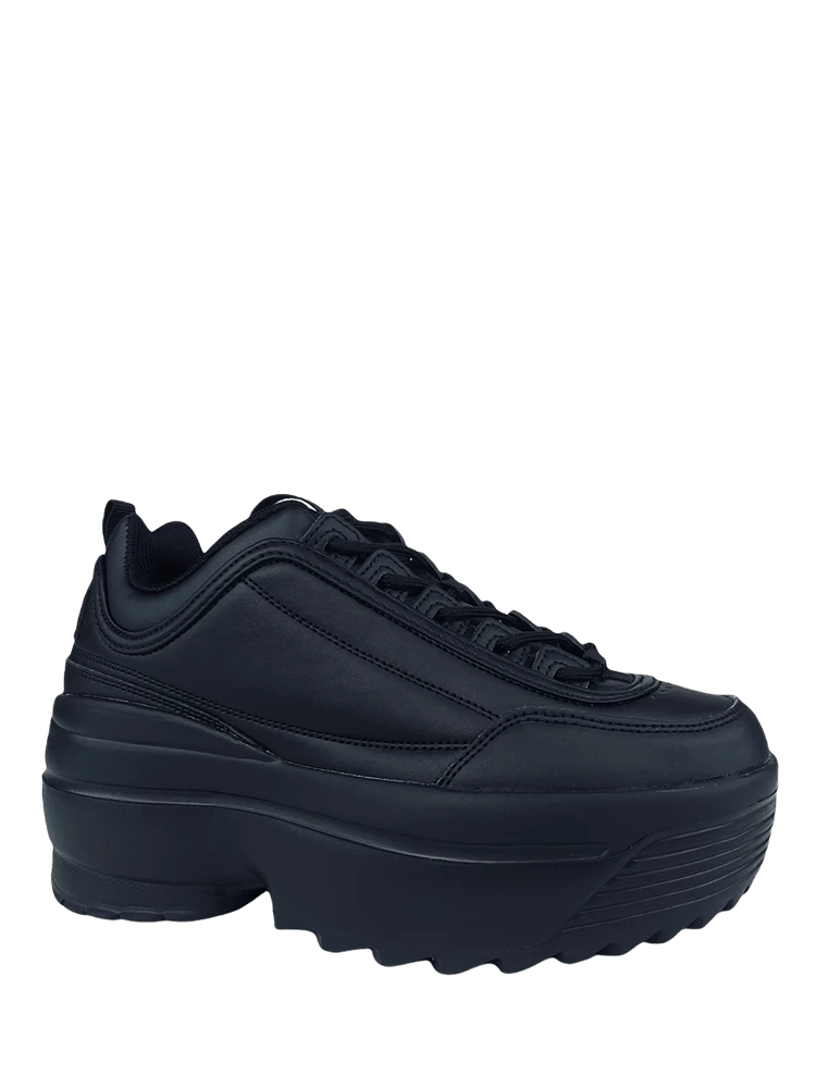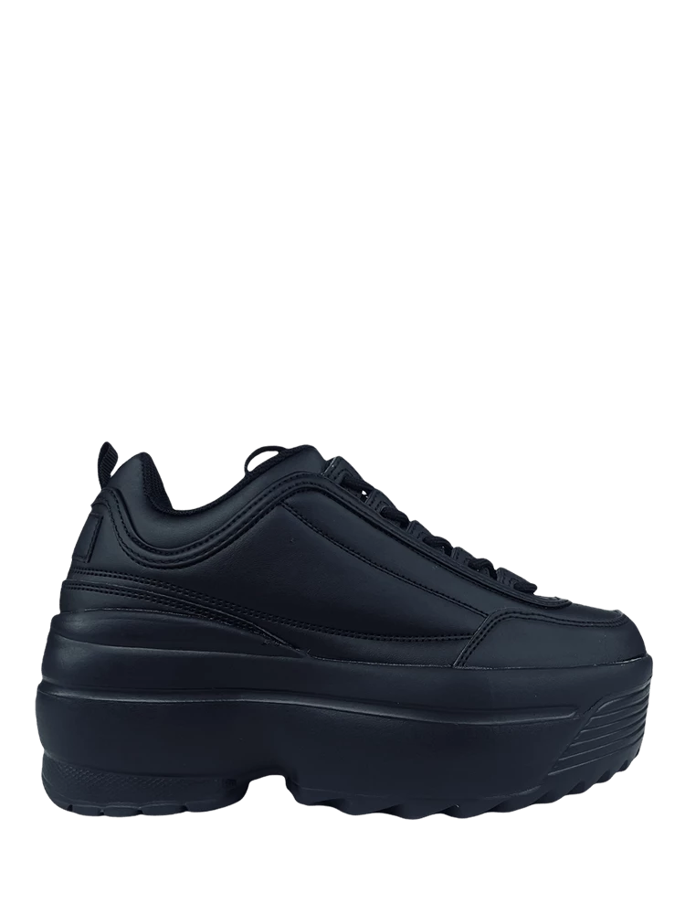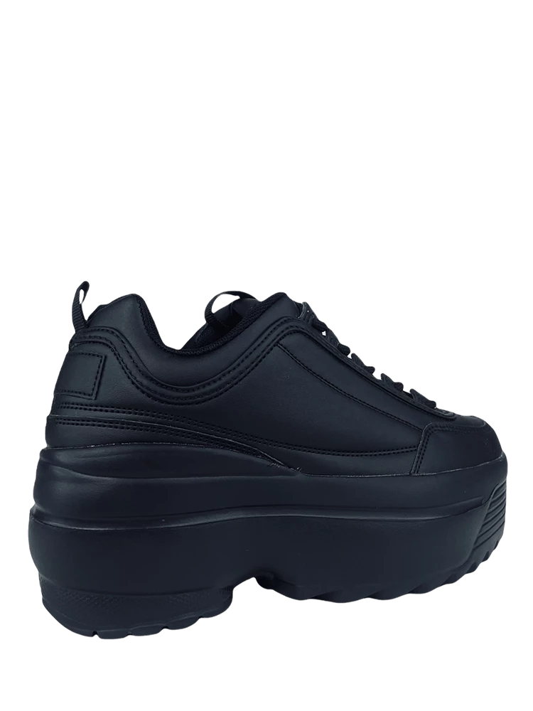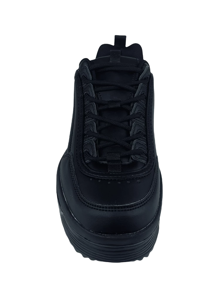Black vegan leather upper. Black round laces. Black tricot lining. Black rubber outsole.