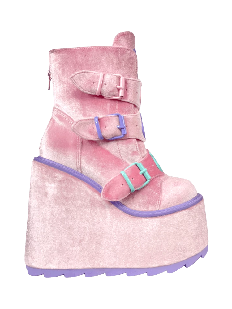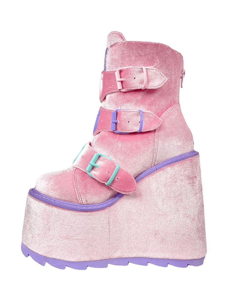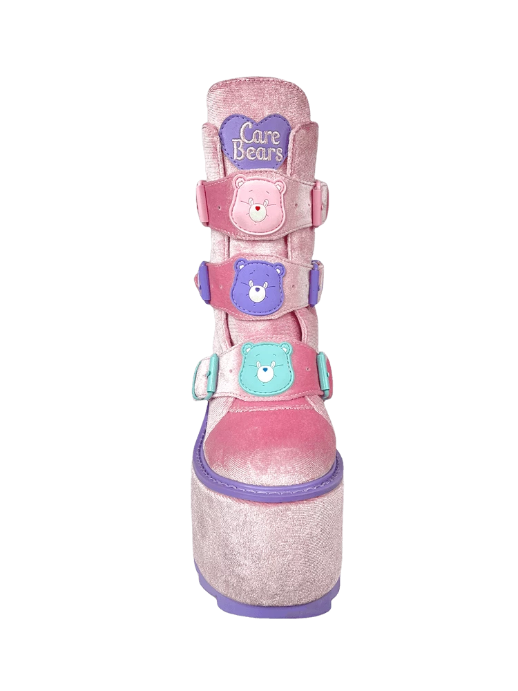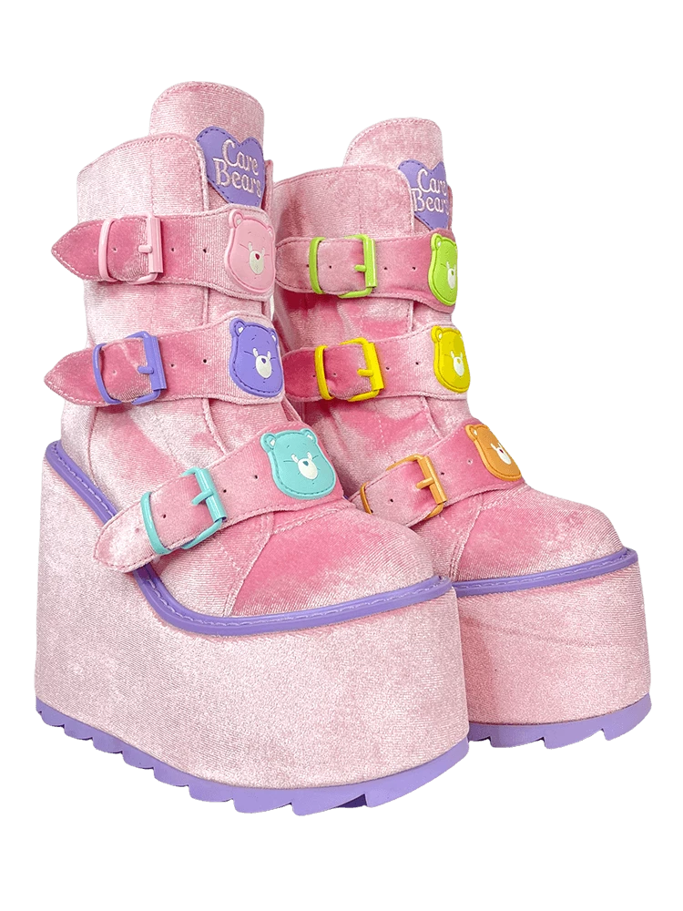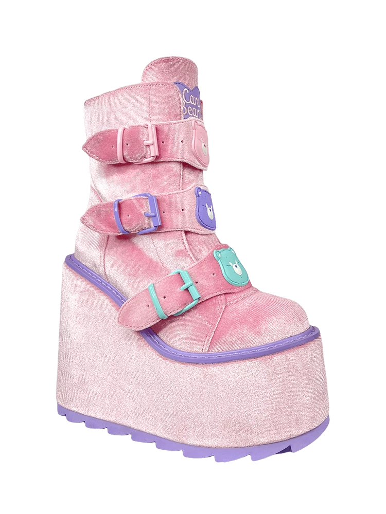Pink velvet upper. Silicone molded Care Bear charms detail. Metal enamel buckles and hardware. Pink velvet-wrapped EVA bottom. Lavender rubber outsole. 6-inch heel, 2.75-inch front platform.