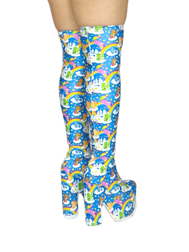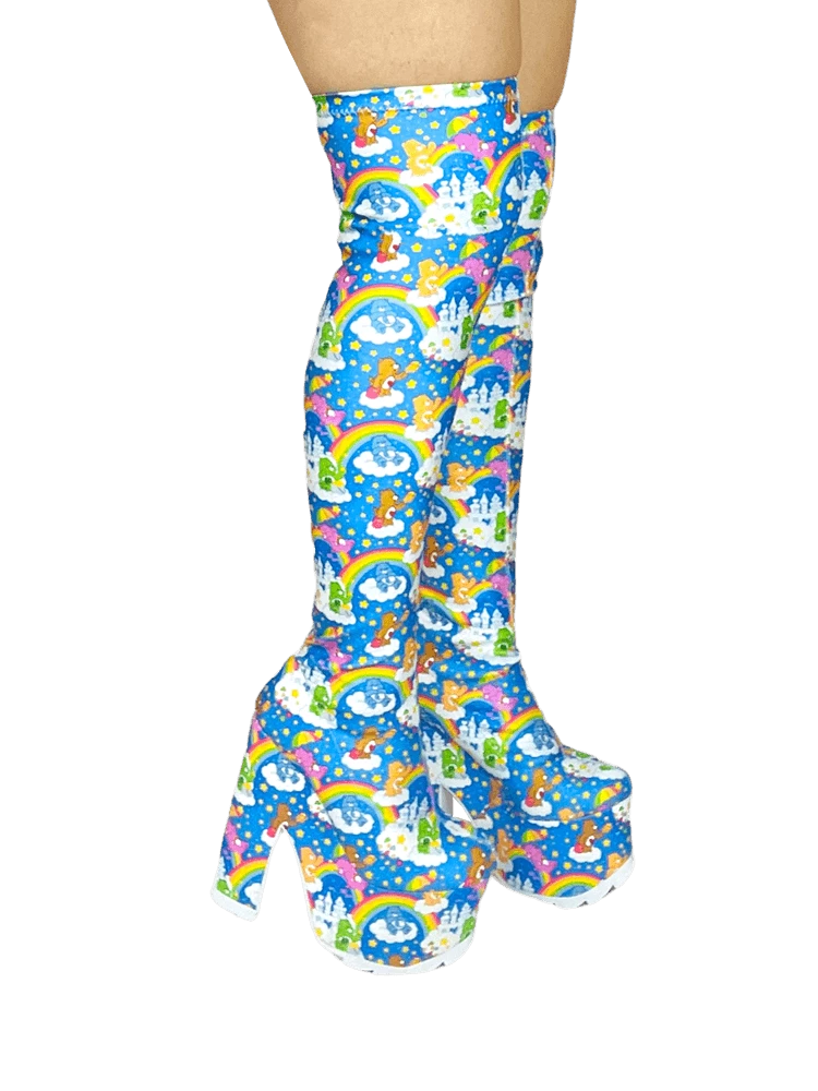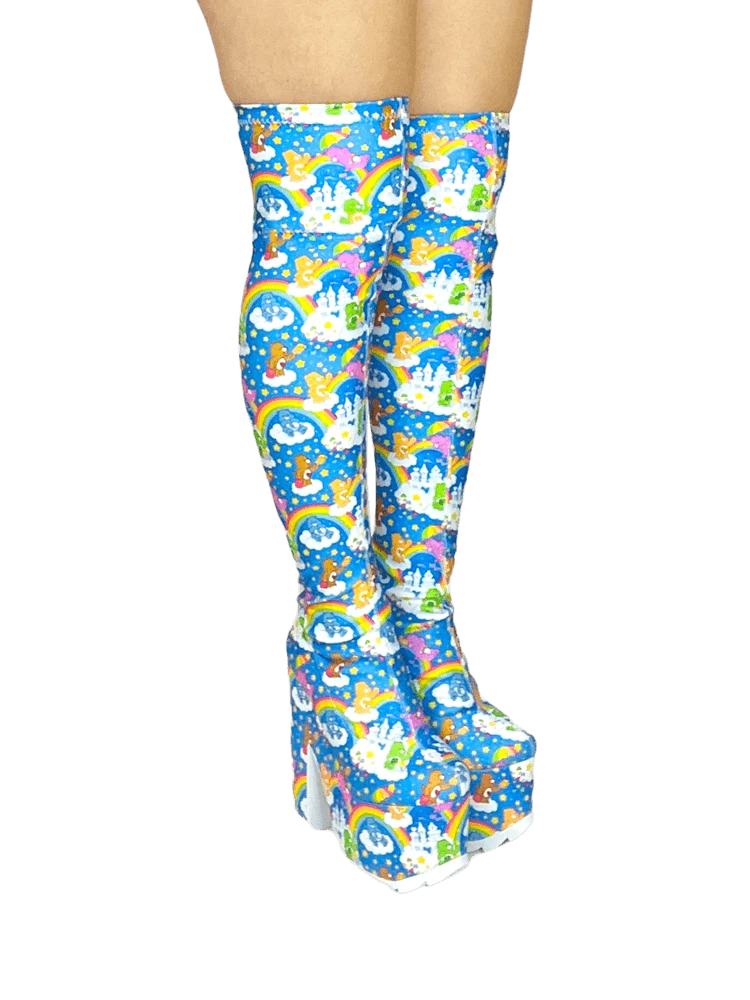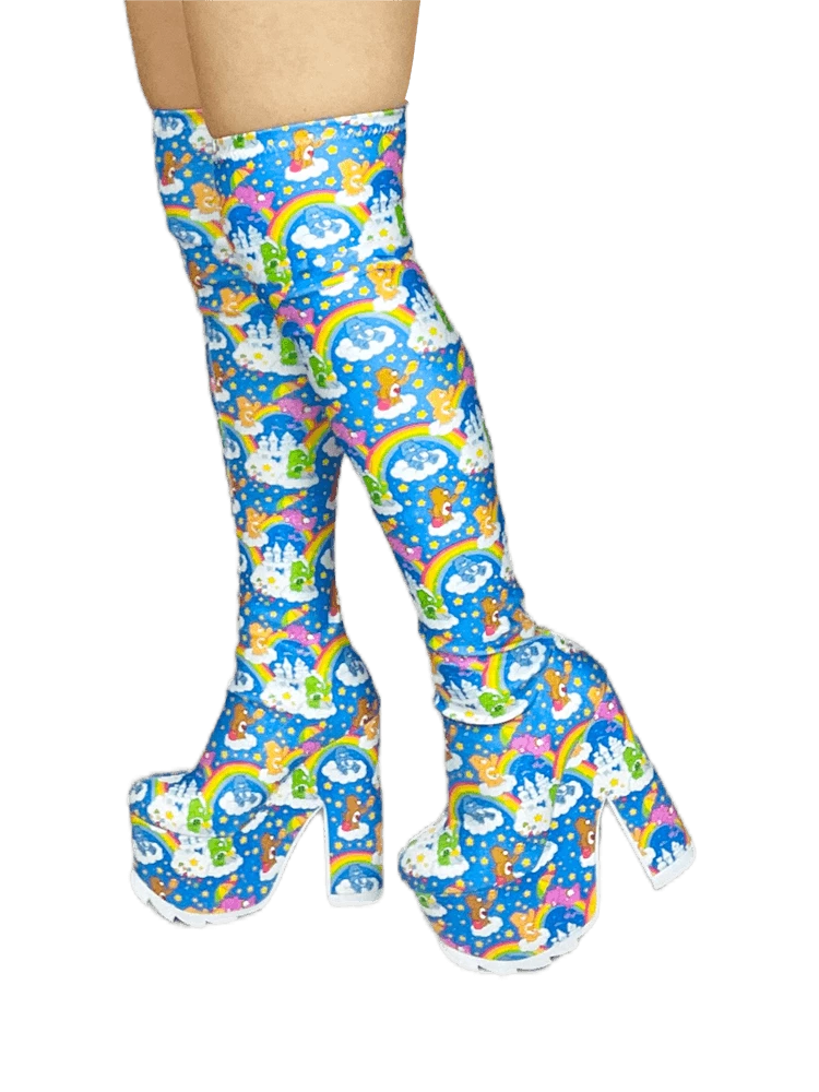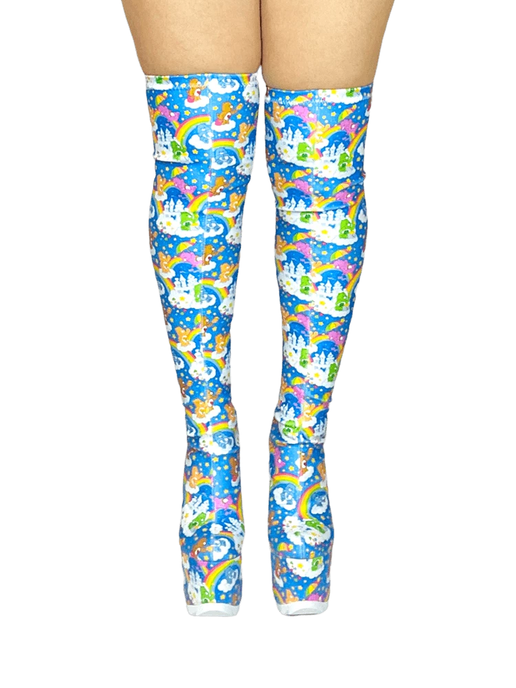 Care Bears sky printed stretch upper with elastic thigh band. Care Bears sky printed wrapped EVA bottom with white rubber outsole.Â