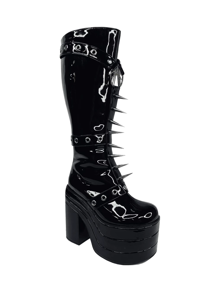 100% Black Patent Vegan Leather with silver grommets and studded strap detail. Black Patent Vegan Leather wrapped platform bottom. Black goring for stretch fit and a zipper closure. Black rubber outsole.