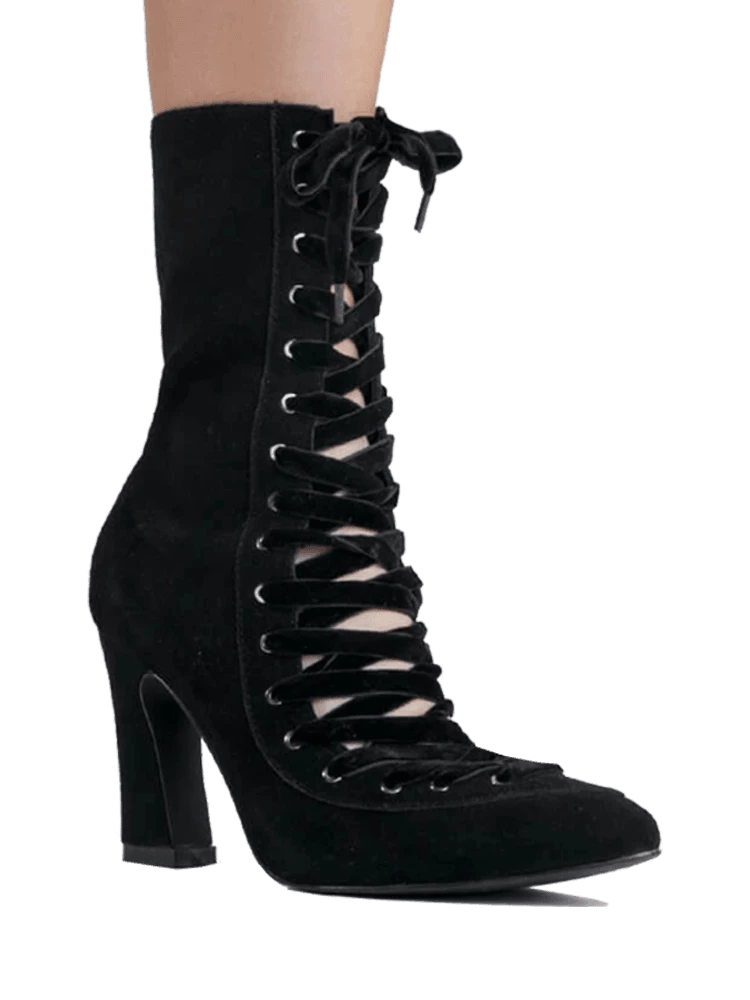 Hello, witches! Summon the spirits in these Victorian-inspired lace-up heels featuring a soft black suede upper, velvet laces, and silver flat grommets.
