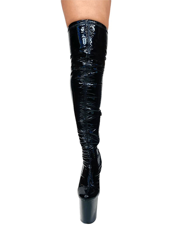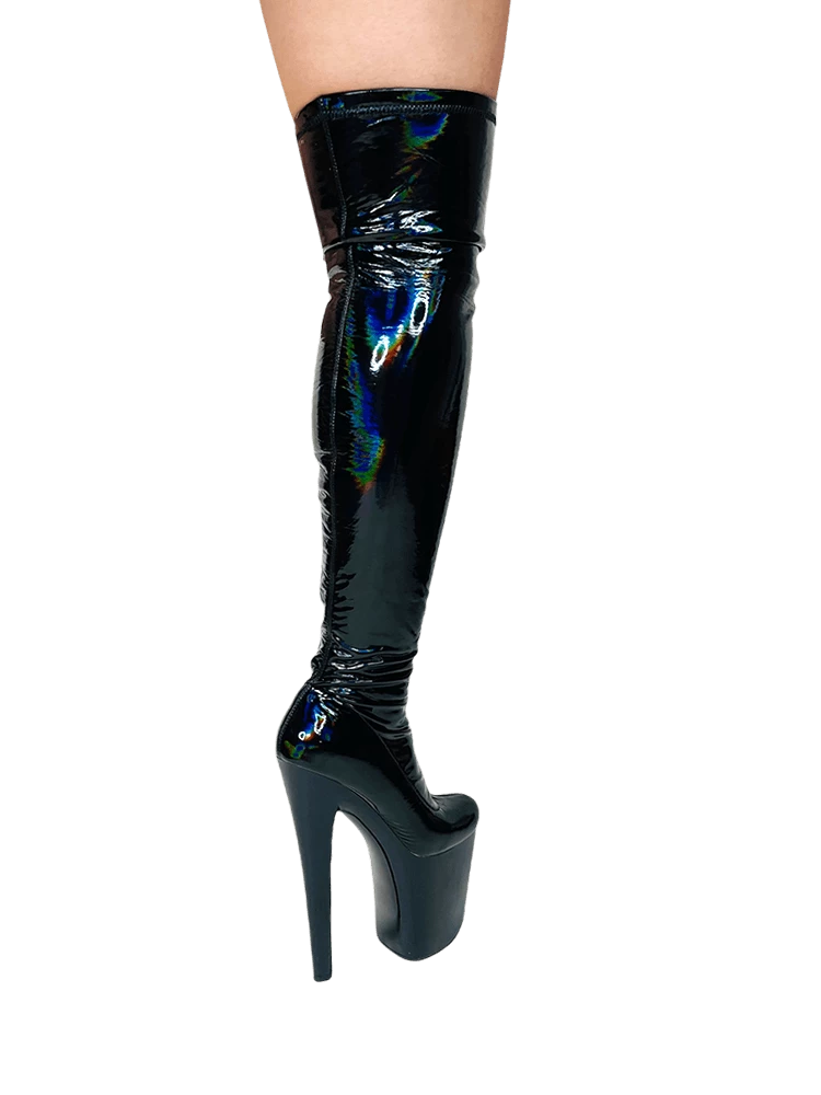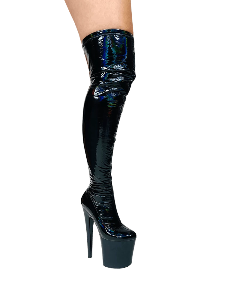Stretch black hologram upper. Shiny black 7.5-inch bottom. Black rubber outsole. US women’s sizing. Man-made materials.