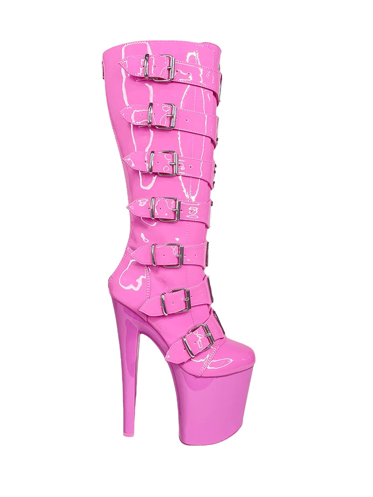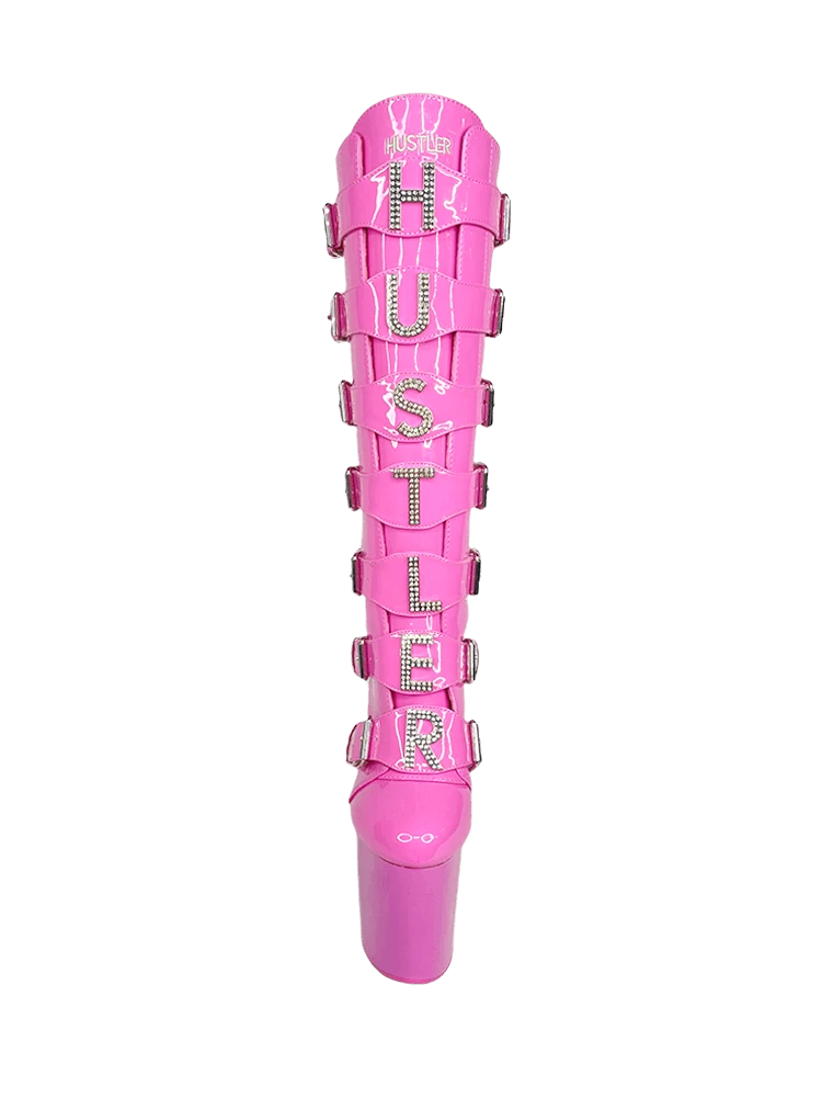7.5-inch heel. Silver chrome buckles and hardware. Silver chrome lettering with white rhinestones. Fuchsia rubber outsole.Â
