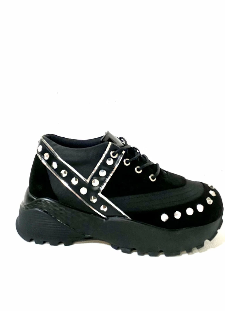 Trail BLAZ3 your fellow sneaker heads with these fierce, punk-stylish, studded gems. Black and chrome, you already know! Try this low look, full of comfort and attitude.
