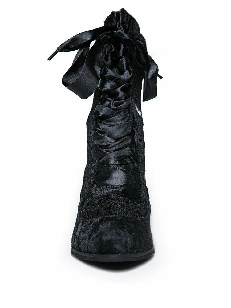 Black lace upper. Black velvet details. Satin ribbon laces. Black rubber outsole. Moon and Star Embroidery.Â