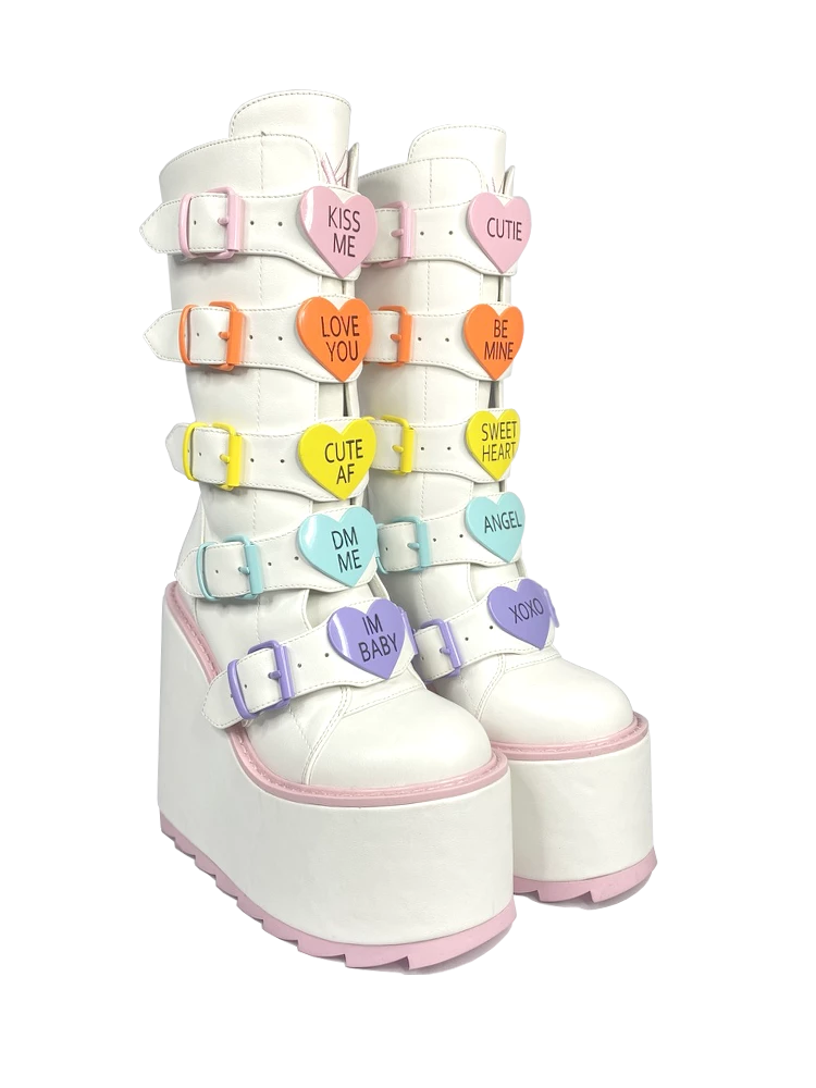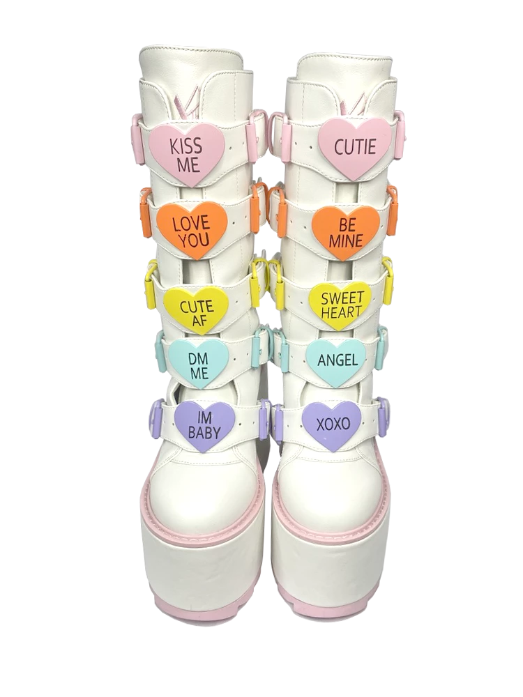 These are cute on another level! Be THE valentine all year-round with these white and pink Dune’s with pastel innocence. Charm all your lovelies with a variety of cute inscriptions on candy-like, heart shaped hardware.