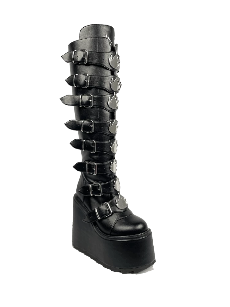This is the New DUNE boot. Fierce, dark fashion from another world, designed for YOU. Unearthed and now ready for you to wear from planet to planet. 6-inch heel, 2.75-inch front platform. 8 Double Straps, Black PU Material, Silver Flame buckle hardware, EVA Platform with Black PU Wrap. US women’s sizing. Man-made materials.