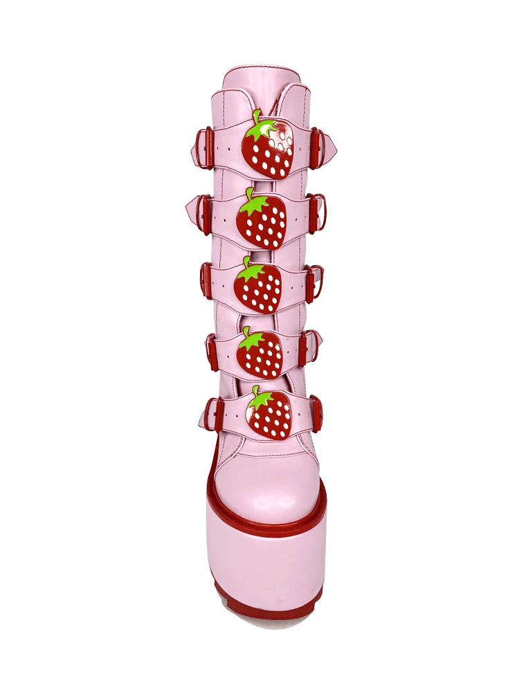 Pink Vegan Leather Upper. Red Rubber Outsole. Red Enamel Buckles. Red Strawberry Charms. Pink Vegan Leather Wrapped Eva Bottom. 6-inch heel. 2 3/4-inch platform. 5 Double Straps. US women’s sizing. Man-made materials.