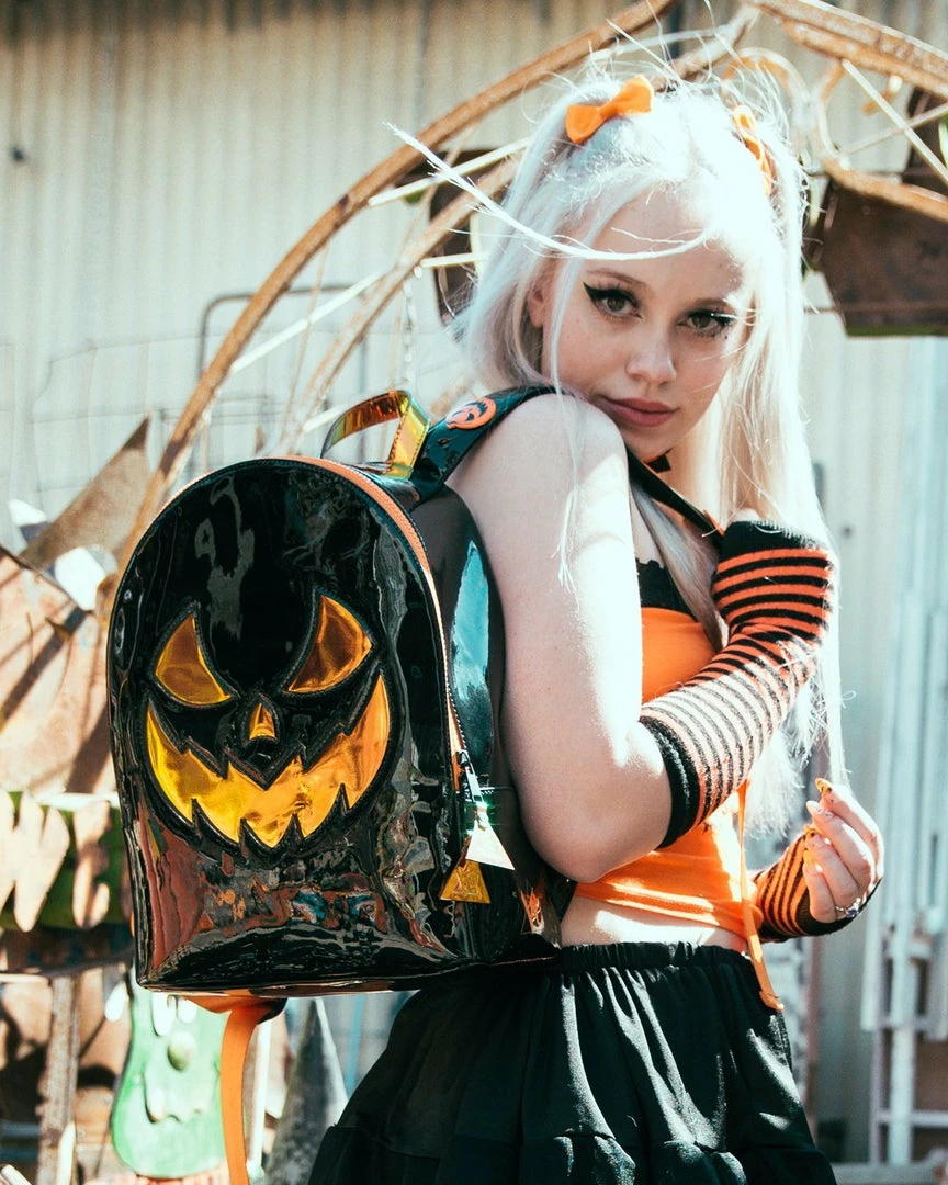 Black Patent Body. Orange Atlantis Jackolantern Face Detail. Adjustable Straps. Orange Enamel Metal Jackolantern Charms On Straps. Zipper Closure.