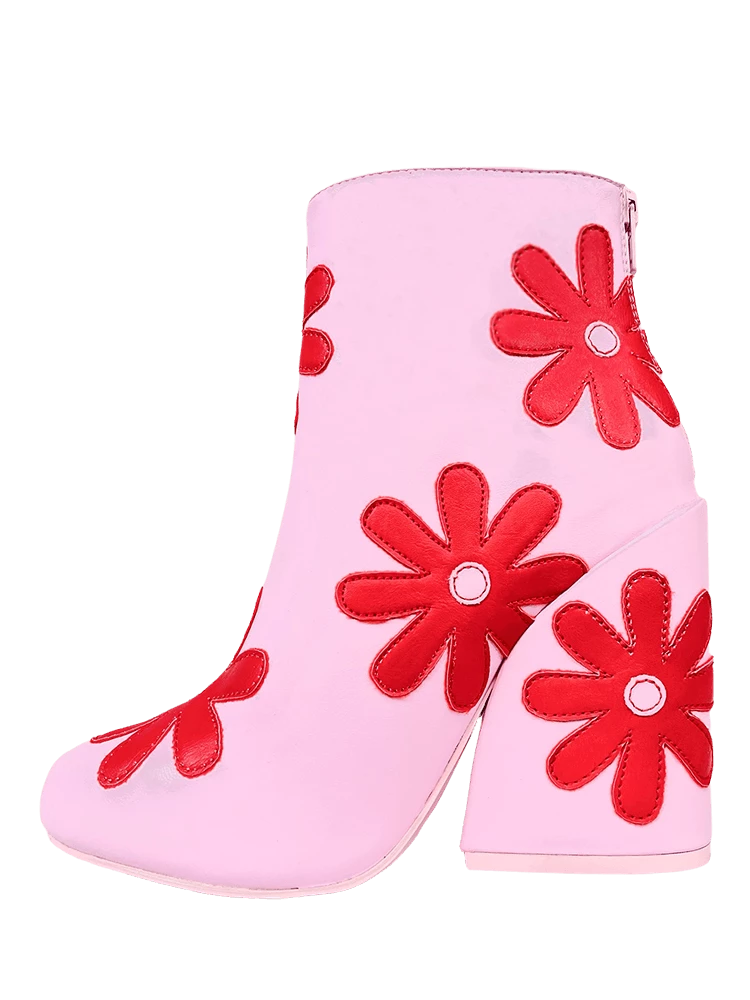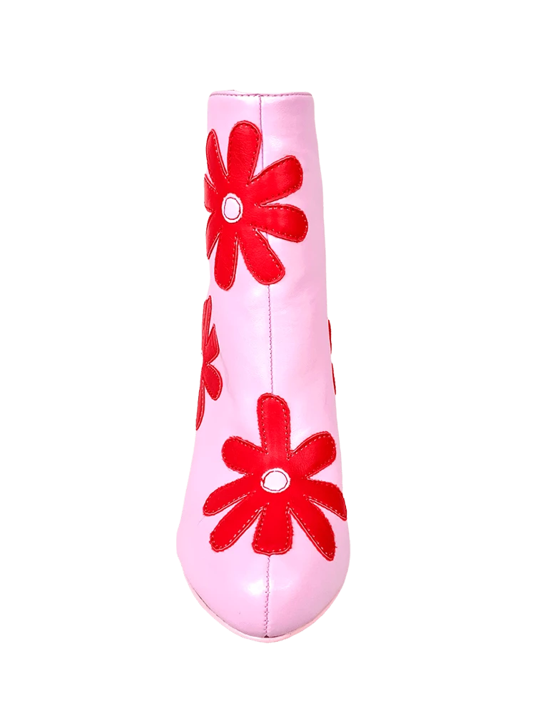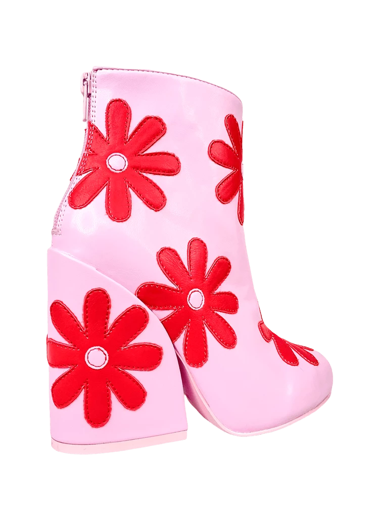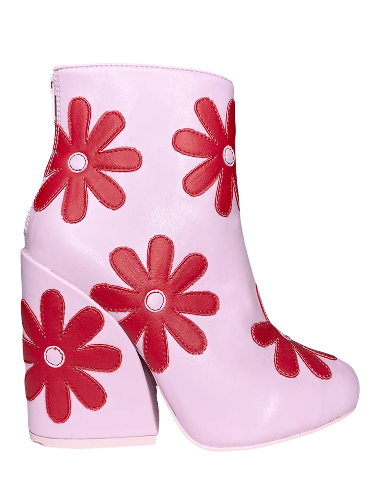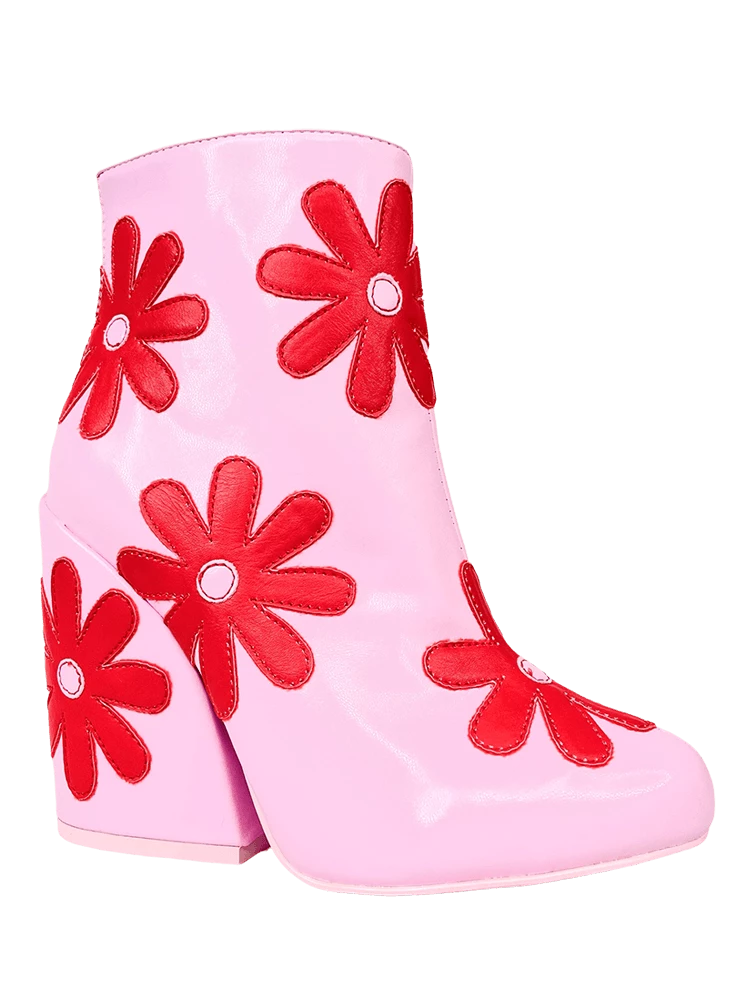 Pink faux-leather upper. Red faux-leather daisy overlays. Pink rubber outsole. Back zipper closure. US women’s sizing. Man-made materials.
